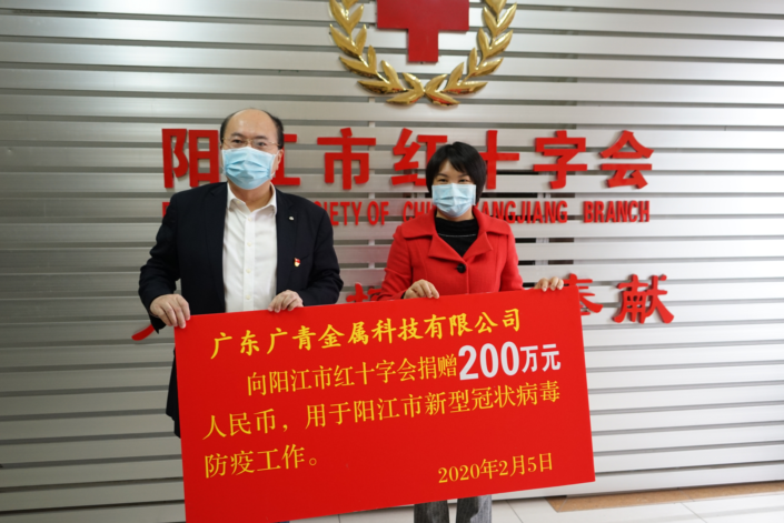 为进一步做好新型冠状病毒感染的肺炎疫情防控工作,保障阳江市医护人员的防护用品供应,确保医护人员的安全,广东广青金属科技有限公司积极响应阳江市红十字会疫情防控工作物资筹集活动,于2月5日向阳江市红十字会捐赠200万元,用于阳江市新型冠状病毒感染的肺炎疫情防控工作,以实际行动践行企业社会责任,为打赢疫情防控阻击战贡献广青力量。