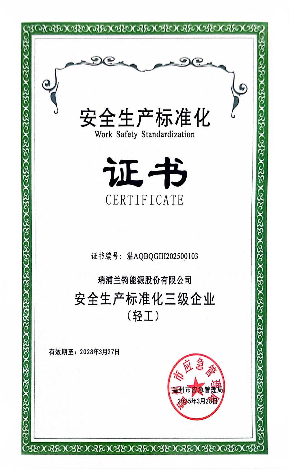 瑞浦兰钧(温州基地)通过国家三级安全生产标准化认证