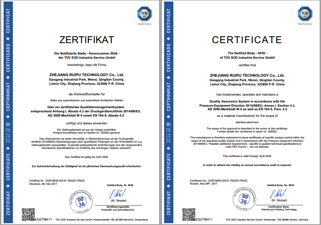 5月17日,经过TÜV SÜD南德认证检测(中国)有限公司前期的一系列现场审核、产品试验以及后期德国TÜV SÜD 总部的审核,浙江瑞浦科技有限公司顺利获得了TÜV SÜD总部颁发的PED和ADWO认证证书。